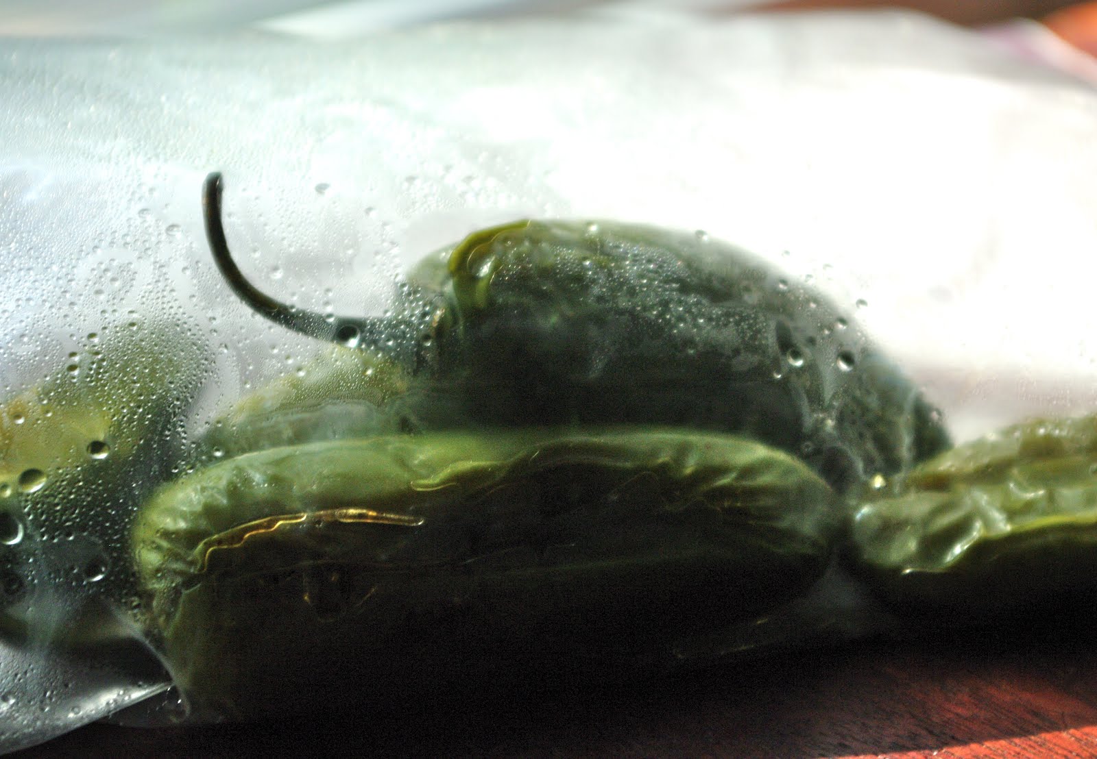 As soon as they’re done in the oven, pop them into a paper or plastic bag and let them steam until they cool down. Then, with gloves on, peel the skin off and the seeds out and chop those guys into little pieces, and set them aside.