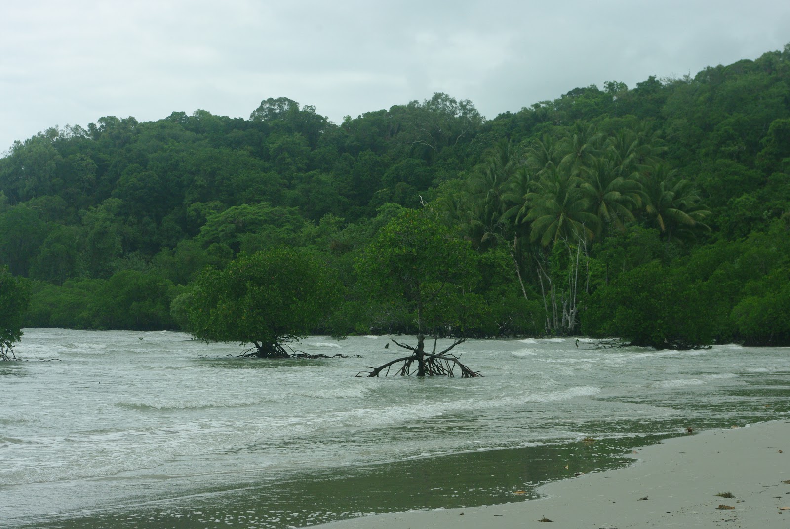 This beach is the only place in the world at which two World Heritage Sites meet. Here the mangrove trees of the Daintree Rainforest stretch way out into the ocean and touch the Great Barrier Reef.