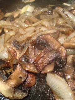When the pan is good and hot (medium-high heat), add in the onions and mushrooms, salt and pepper them (about 1/8 tsp. each) and let them sauté for several minutes until they are golden and softened.