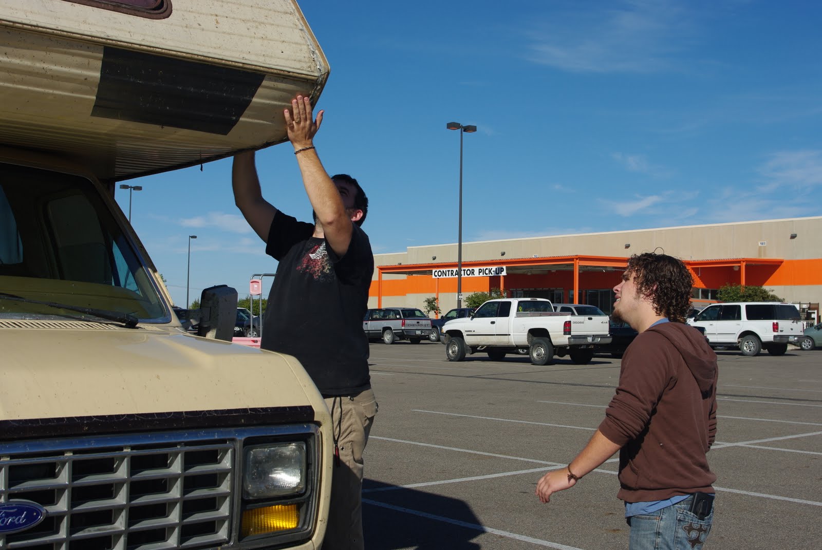 On Saturday, we were driving through Kansas when all of the sudden…Dorothy ran out of the field!! Haha I’m just kidding, that would’ve been awesome though. Anyway, all the sudden, a chunk of the RV goes flying off into the wind!! We were on the Highway so we couldn’t even go back and get it. So we pulled off the road and saw that a 2 foot by 2 foot piece of the paneling on the outside of the RV was just gone. We found the nearest Home Depot, and us ladies sat in the RV for the day while the boys fixed it up. They bought some fancy sheet metal and a new drill, and cut a piece to fit the bare spot. What bright young men. It looks lovely.